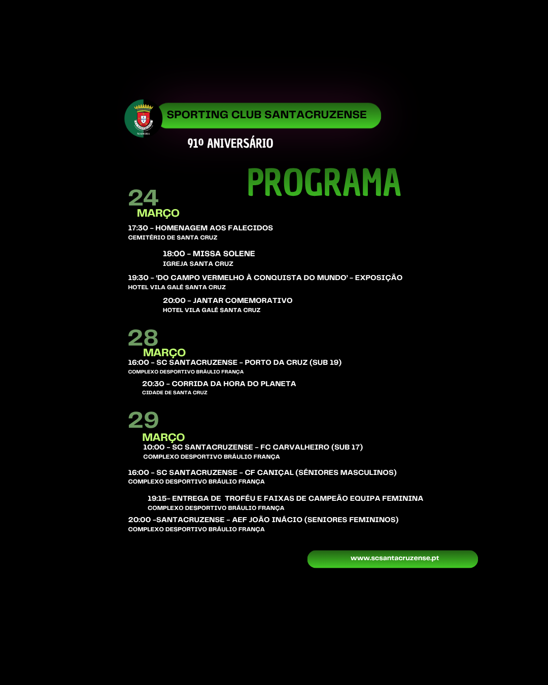 O SC Santacruzense completa oficialmente esta terça-feira 91 anos de existência e para assinalar a data foi elaborado um vasto programa comemorativo que contempla a realização de diversas atividades. Assim, e como habitualmente, s...